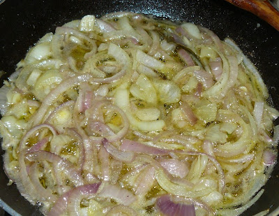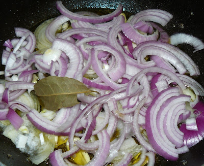 No azeite que serviu para fritar as petingas, refogue sem deixar chegar a alourar, a cebola, os alhos e a folha de louro.
