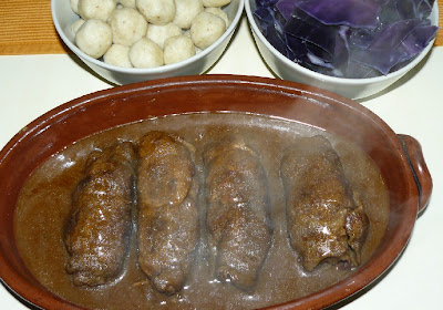 Sendo esta 66ª Trilogia, com a Ana e o Cupido, submetida ao tema “Alemanha”, e tendo eu da cozinha teutónica um conceito esteriotipado, como o são todos os preconceitos, de uma cozinha algo espartana e até um pouco boçal, entre as mil e quinhentas variedades de salsicha e outras tantas de cerveja, Eisbein, Kartoffelsalate ou Apfelstrudel, acabei por não optar por esses pratos emblemáticos e ficar por este simpático e delicioso Roulade, que acompanhei com esses tradicionais bolinhos de batata (Kartoffelklöße), parecidos com gnocchi e, claro, com uma inevitável couve (Kraut), esse acompanhamento universal na Alemanha, de tal modo que os alemães são muitas vezes alcunhados por “Krauts”.