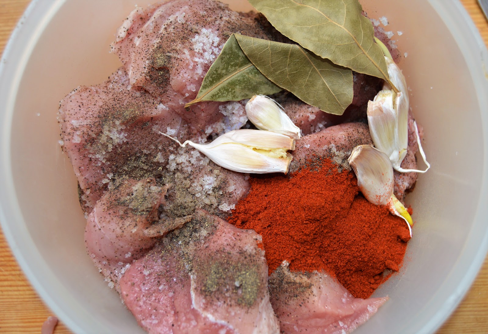 pimenta, louro, alhos esmagados com a sua casca e pimentão-doce, se desejar que